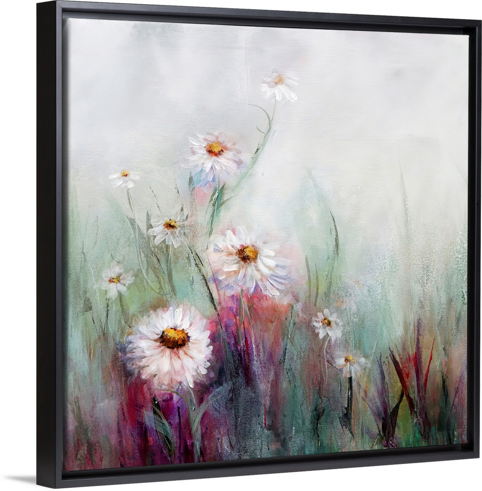 <p>An ethereal painting of white oxeye daisies mixed with tones of pink in front of a misty white background</p>