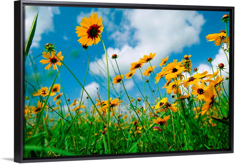 <p>From the National Geographic Collection, a large photograph taken from the ground shows a field packed with brightly colored flowers as they enjoy a sunny day.</p>