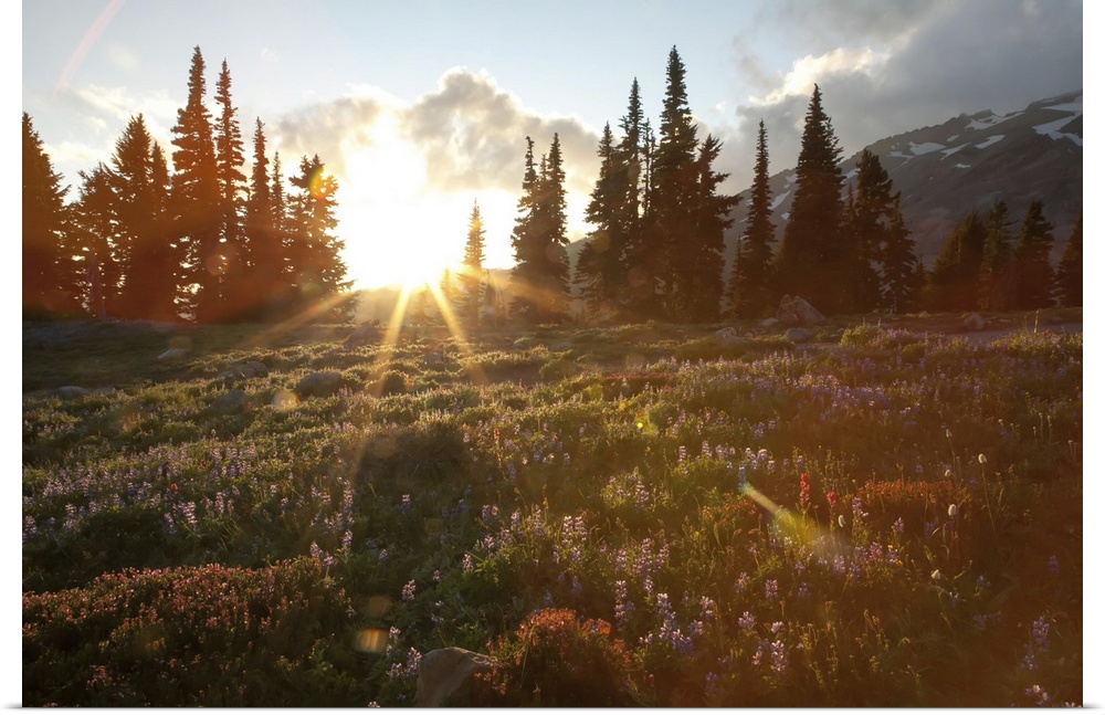 <p>Wildflowers cover a landscape on Mount Rainier as the sun sets behind evergreen trees. Mount Rainier National Park, Washington</p>