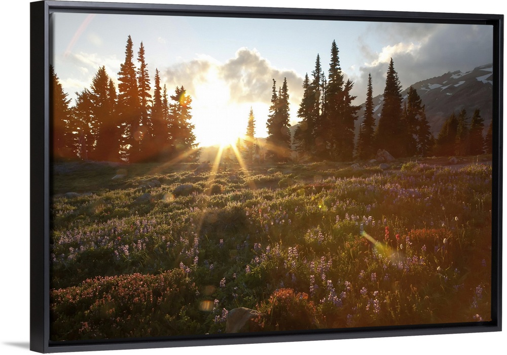 <p>Wildflowers cover a landscape on Mount Rainier as the sun sets behind evergreen trees. Mount Rainier National Park, Washington</p>