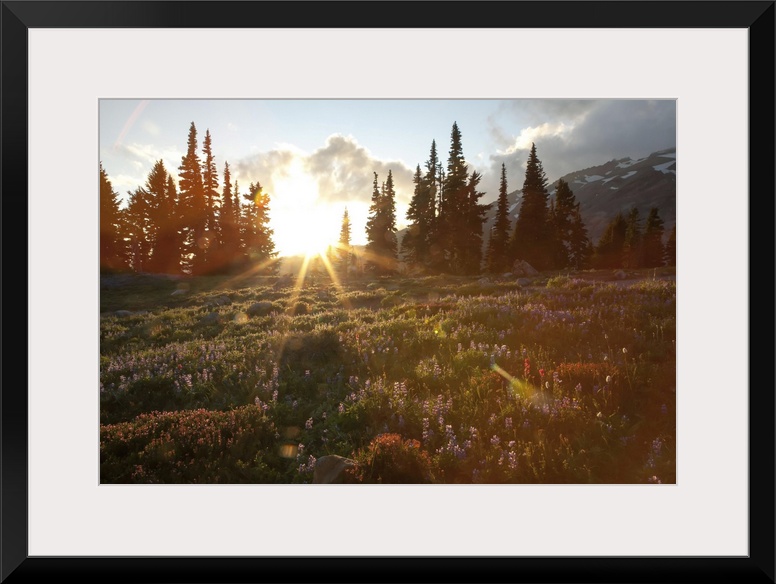 <p>Wildflowers cover a landscape on Mount Rainier as the sun sets behind evergreen trees. Mount Rainier National Park, Washington</p>
