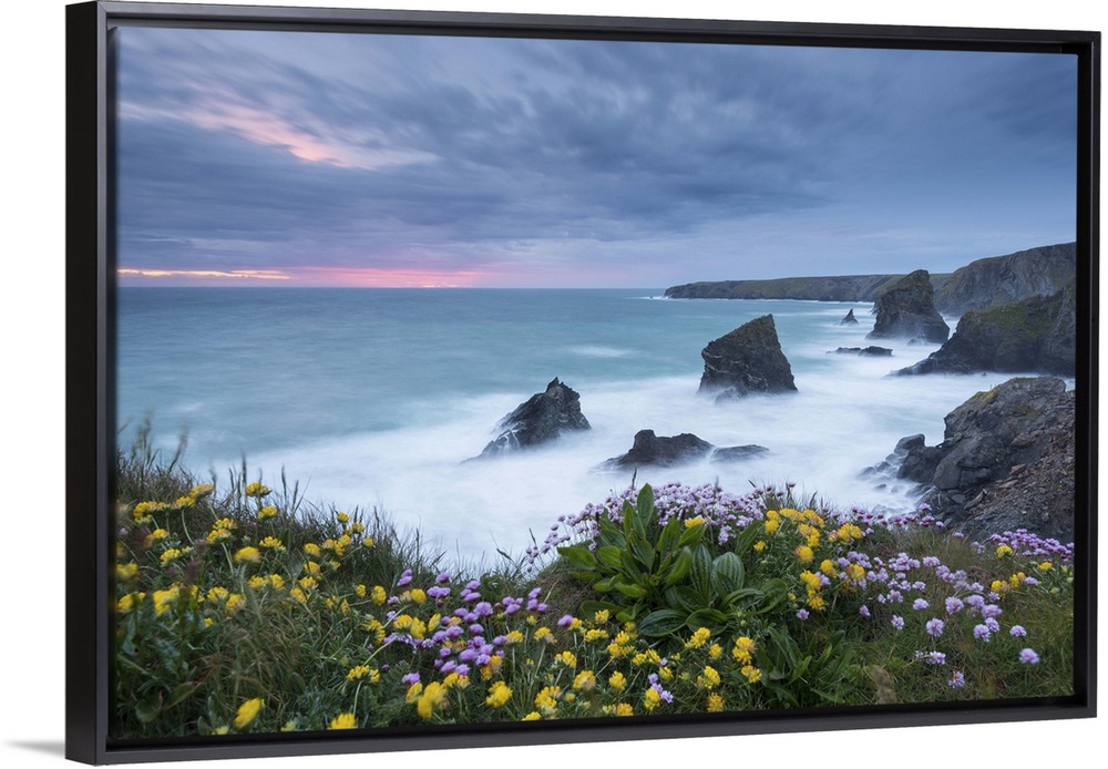 <p>Wildflowers growing on the clifftops above Bedruthan Steps on a stormy evening, Cornwall, England. Spring (May)</p>