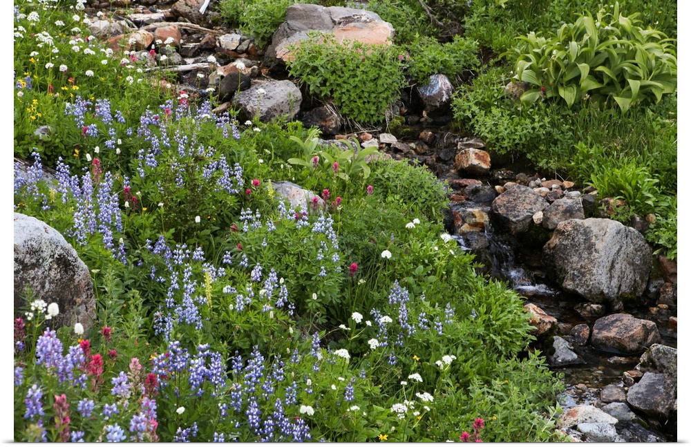 <p>Wildflowers, rocks and a small flowing stream in a landscape on Mount Rainier.</p>
