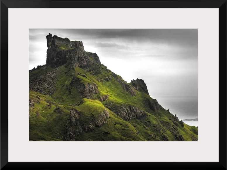 <p>Fine art photo of rocky spires on a green hill under a cloudy sky.</p>