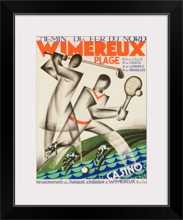 <p>ca 1920s French travel poster, Chemin de fer Nord Wimereux. Art deco stylied golf and tennis plays with beach, horse racing and casinos toutaed as only 3 hours from Paris and 4 hours from London. Illustrated by Leo Dupin</p>