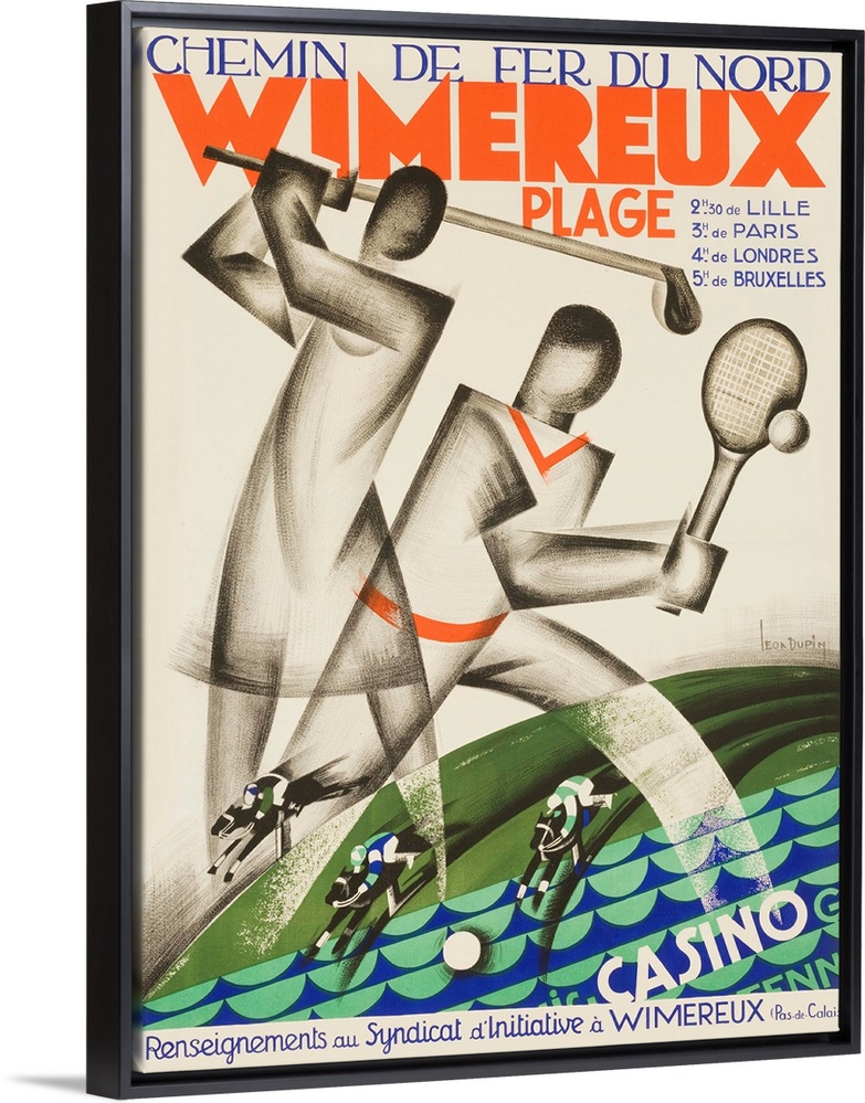 <p>ca 1920s French travel poster, Chemin de fer Nord Wimereux. Art deco stylied golf and tennis plays with beach, horse racing and casinos toutaed as only 3 hours from Paris and 4 hours from London. Illustrated by Leo Dupin</p>