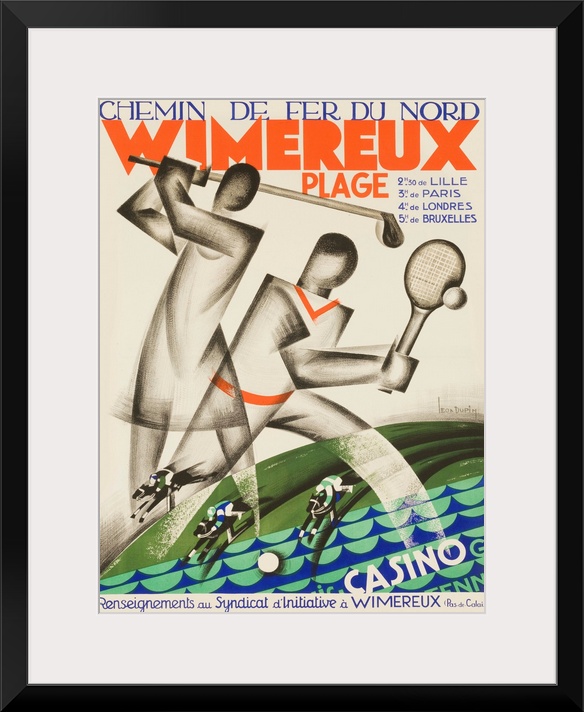 <p>ca 1920s French travel poster, Chemin de fer Nord Wimereux. Art deco stylied golf and tennis plays with beach, horse racing and casinos toutaed as only 3 hours from Paris and 4 hours from London. Illustrated by Leo Dupin</p>