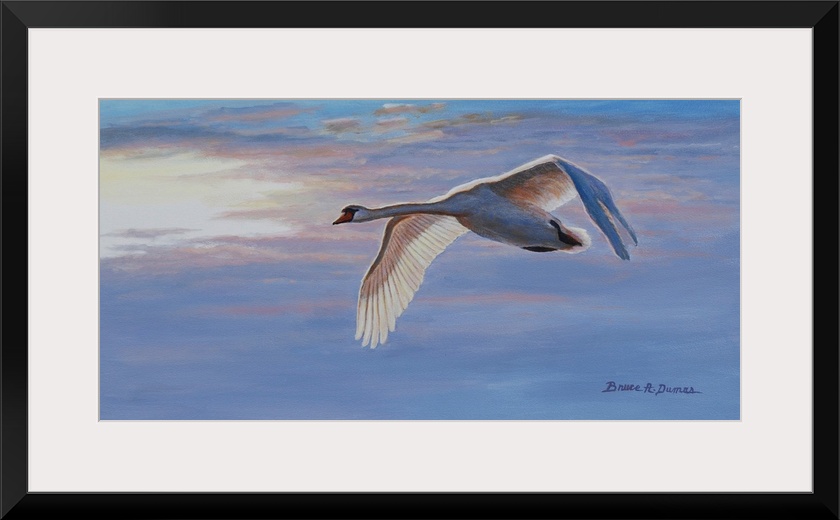 <p>Contemporary artwork of a swan in flight at sunset</p>