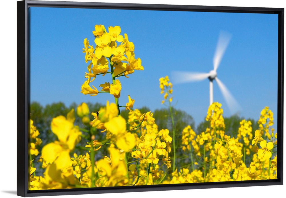 <p>Wind turbine in a rape field. Wind power is a renewable and clean source of energy for electricity production. The wind turns the blades, and this drives a turbine to generate electricity. The oil seed rape plant (Brassica napus) is cultivated for its seeds, which contain an oil that is used in the production of vegetable oil, animal feed and biodiesel.</p>