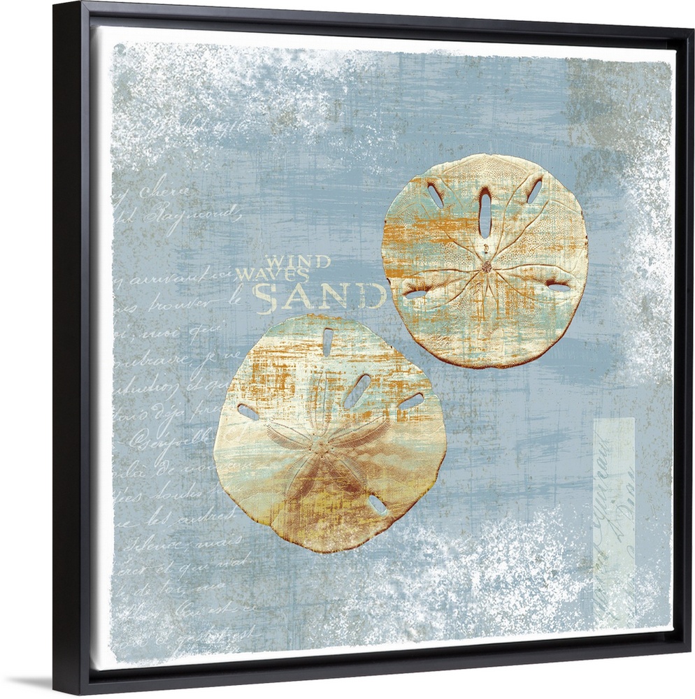 <p>Two sand dollars are painted against a faded blue background with soft cursive text written on the left side of the print.</p>