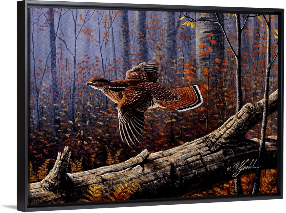 <p>A ruffed grouse in flight through the fall trees.</p>