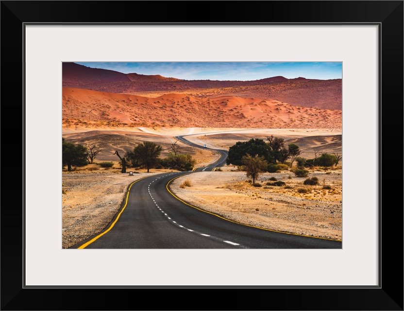 <p>Sossusvlei, Namib-Naukluft National Park, Namibia, Africa. Winding Paved Road Among The Sand Dunes.</p>