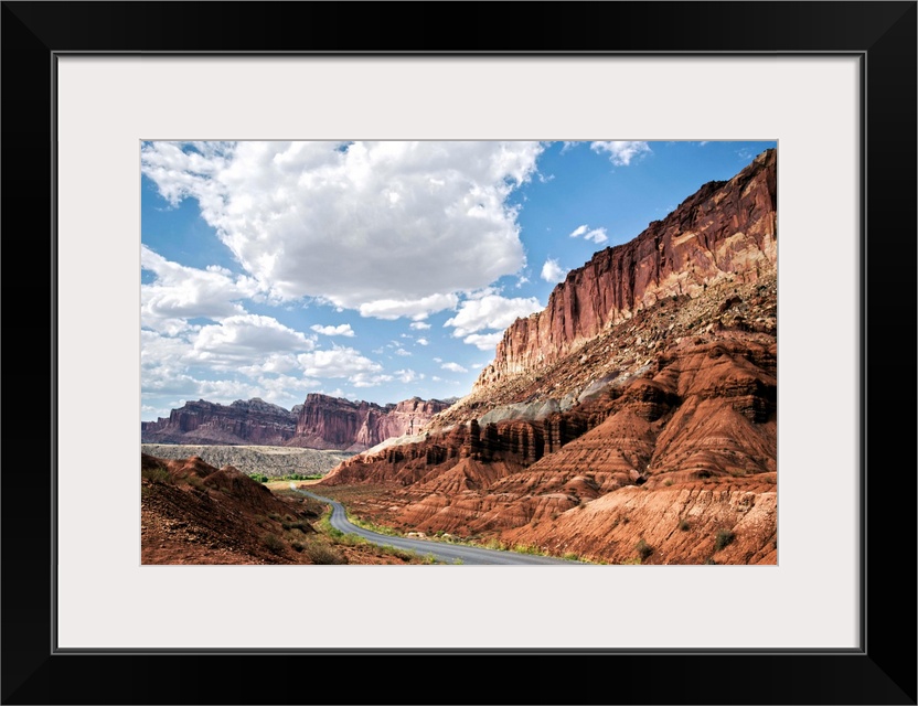 <p>A road winds through Capitol Reef National Park while puffy clouds scatter across a bright blue sky.</p>
