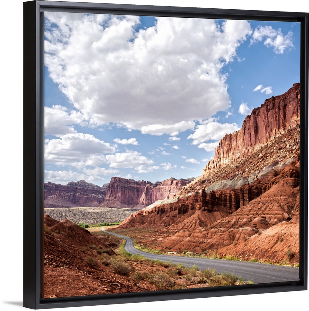 <p>A road winds through Capitol Reef National Park while puffy clouds scatter across a bright blue sky.</p>