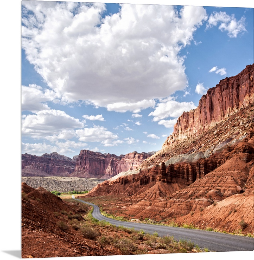 <p>A road winds through Capitol Reef National Park while puffy clouds scatter across a bright blue sky.</p>