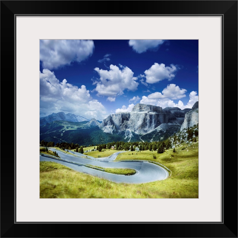 <p>Winding road in a forest of Dolomite Alps against moody clouds, Northern Italy.</p>