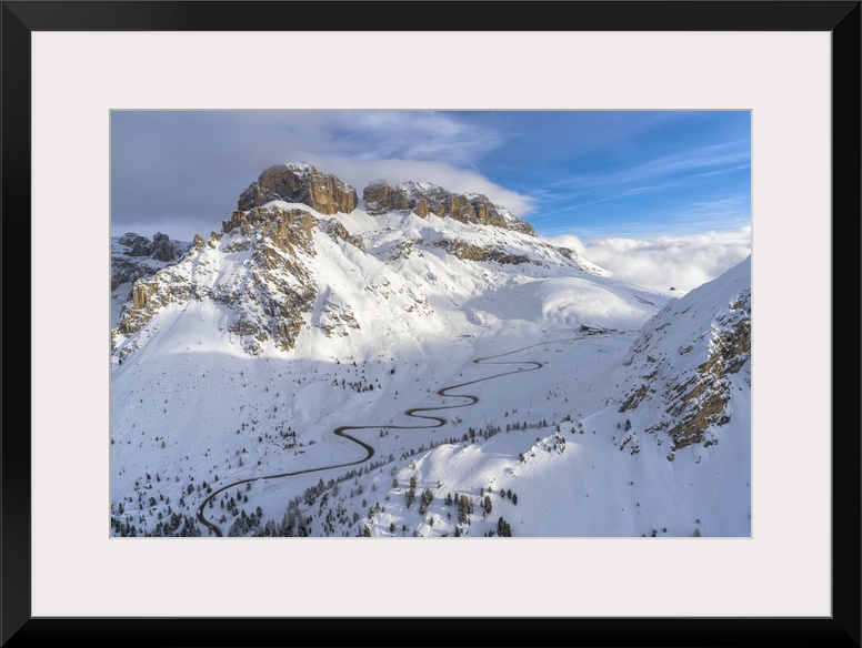 <p>Winding road in the snow, aerial view, Pordoi Pass, Dolomites, Trentino-Alto Adige, Italy, Europe</p>