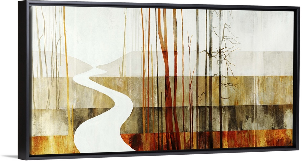 <p>Contemporary art of a winding path leading through a forest of thin trees toward a mountain range on the horizon. The background is composed of thick horizontal stripes in varying earth tones.</p>
