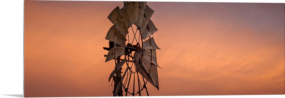 <p>A photograph of a farm windmill under an orange sky.</p>