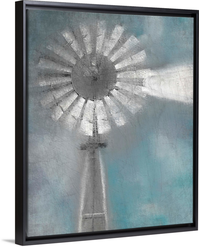 <p>An image in shades of gray and blue of a windmill with a textured overlay.</p>