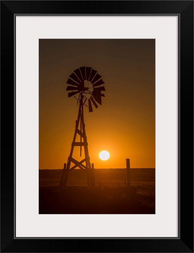 <p>Silhouette photograph of a windmill at sunset with the round sun sitting right above the horizon line.</p>