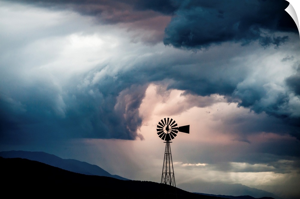 <p>Landscape photograph with a silhouetted windmill amongst rolling hills and a dramatic cloudy sky.</p>
