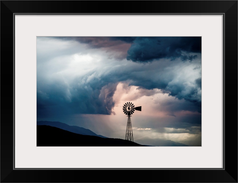 <p>Landscape photograph with a silhouetted windmill amongst rolling hills and a dramatic cloudy sky.</p>
