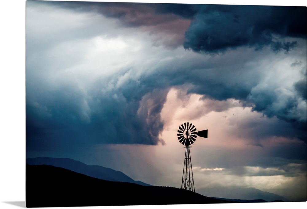 <p>Landscape photograph with a silhouetted windmill amongst rolling hills and a dramatic cloudy sky.</p>