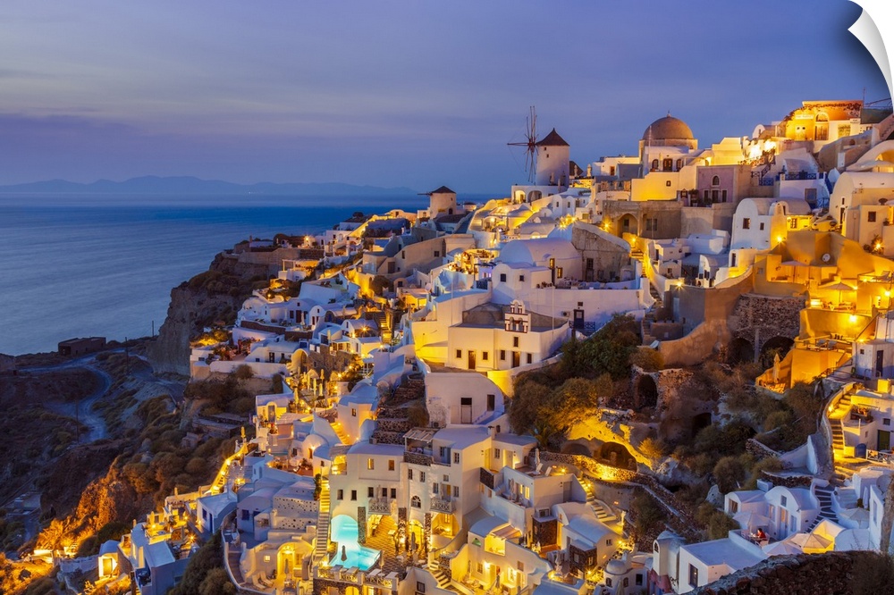 <p>Windmill and traditional houses after sunset, Oia, Santorini (Thira), Cyclades Islands, Greek Islands, Greece, Europe</p>