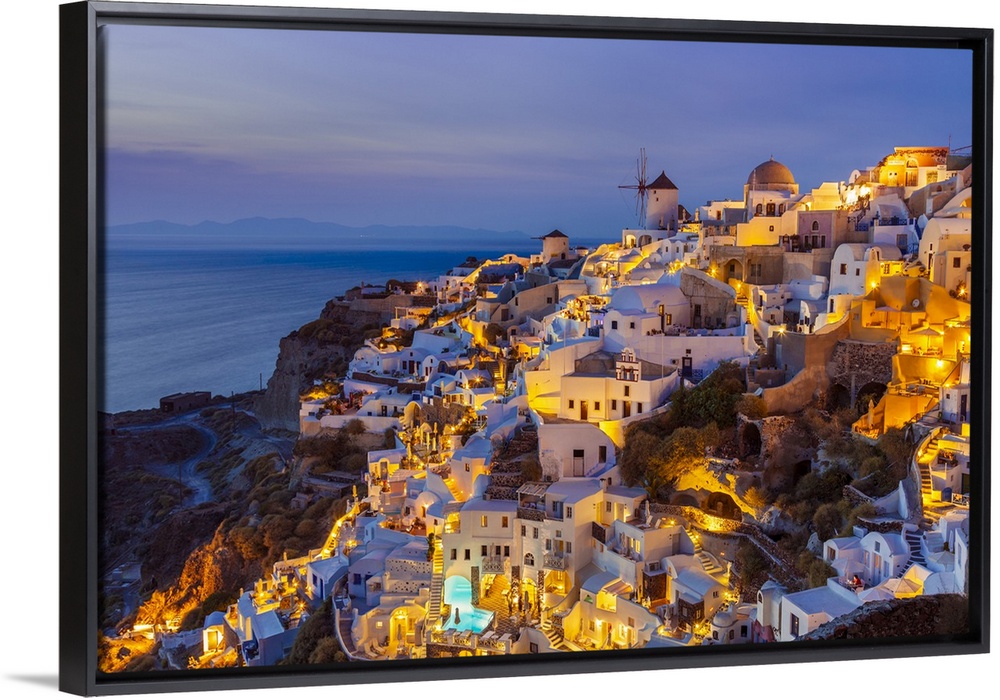 <p>Windmill and traditional houses after sunset, Oia, Santorini (Thira), Cyclades Islands, Greek Islands, Greece, Europe</p>