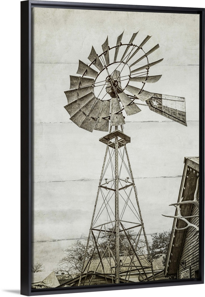 <p>A black and white image of a windmill at a farm with a wood panel effect.</p>