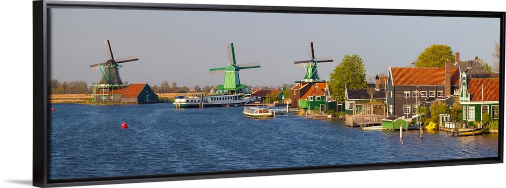 <p>Windmills along the Zaan River at Zaanse Schans, Zaandam, North Holland, Netherlands</p>