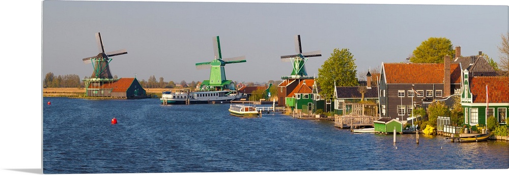<p>Windmills along the Zaan River at Zaanse Schans, Zaandam, North Holland, Netherlands</p>