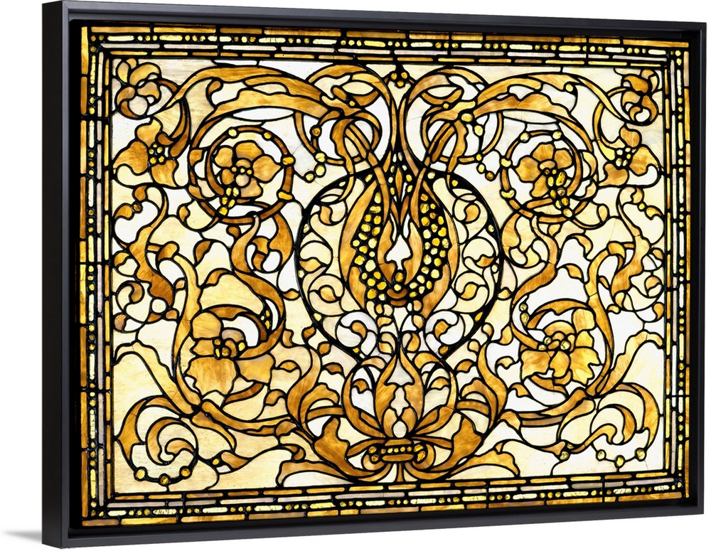 <p>In addition to the enormous holdings from the H.O. Havemeyer collection, the Metropolitan owns a small number of important furniture and decorations from the Havemeyers' Tiffany-designed Fifth Avenue house. The music room featured delicately carved woodwork and furniture, and the walls were sheathed in Japanese silks. The golden color of the furnishings and the interlaced designs of the carved wood were complemented by a highly decorative series of three transom windows, installed in the room's bay. The central panel, here, is composed of undulating leafy scrolls and blossoms emanating from a pomegranate-like fruit. Its subtle monochrome palette in opalescent, amber, and gold tones harmonized with the furniture in the room. The sinuous curves reflect the fluidity and sensuality of the art nouveau style, which reached its high point in Europe about 1900. Rough-cut amber glass jewels punctuate the composition, producing a golden sparkle when light shines through them.</p>