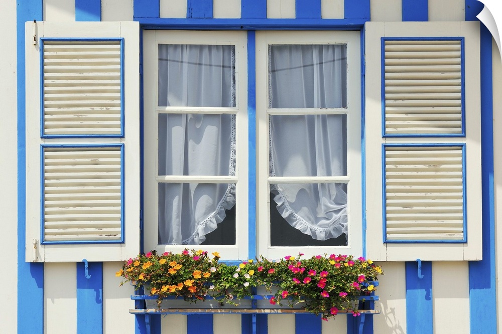 <p>Window of a traditional striped painted house in the little seaside village of Costa Nova, Portugal</p>