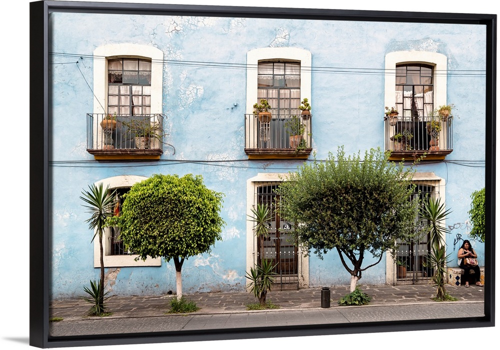 <p>Photograph of a light blue exterior lined with windows, doors, and trees. From the Viva Mexico Collection.</p>