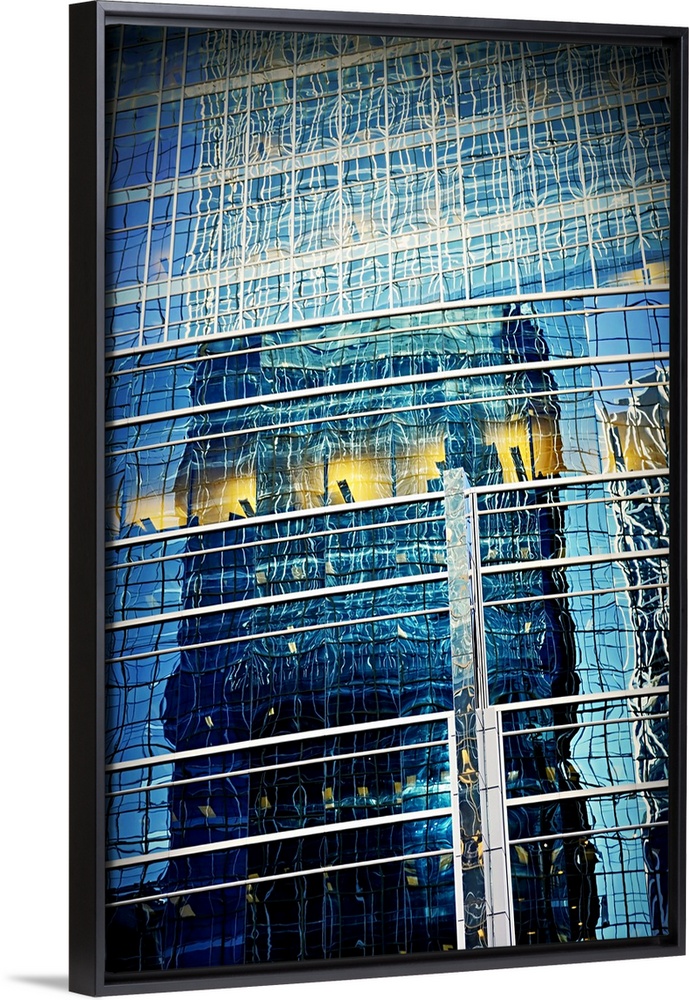 <p>Warped and curved reflection of a tall building seen in the windows of a neighboring skyscraper, creating an abstract image.</p>