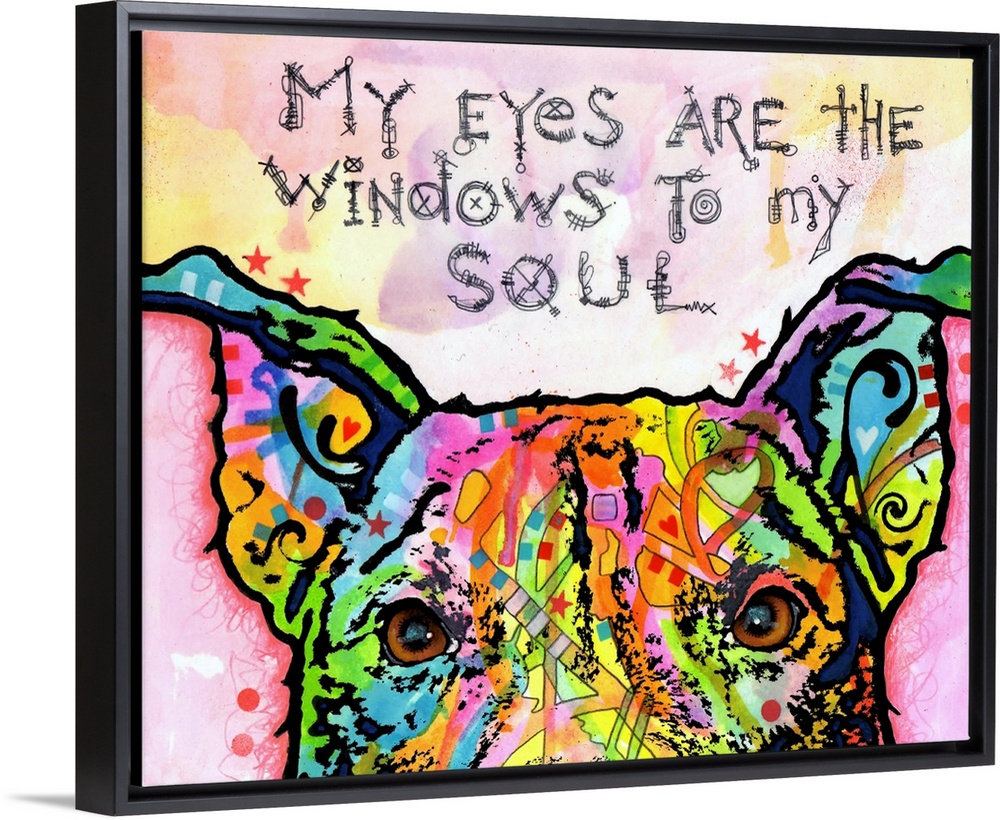 <p>Contemporary stencil painting of a dog filled with various colors and patterns with text, "My eyes are the windows to my soul."</p>
