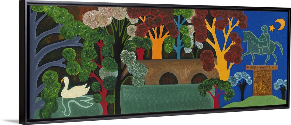 <p>Contemporary painting of a statue and bridge in a park.</p>