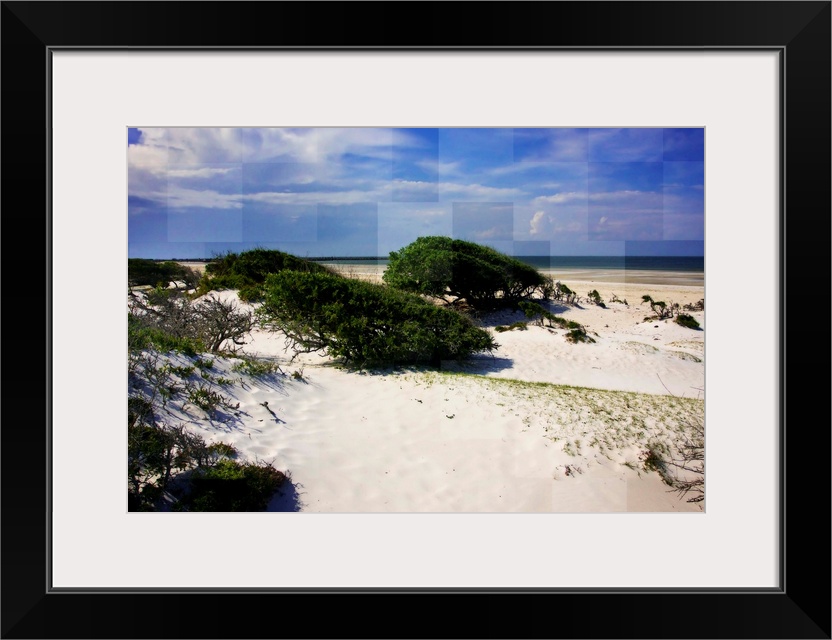 <p>A sandy beach under a bright blue sky, with square shapes in the sky.</p>