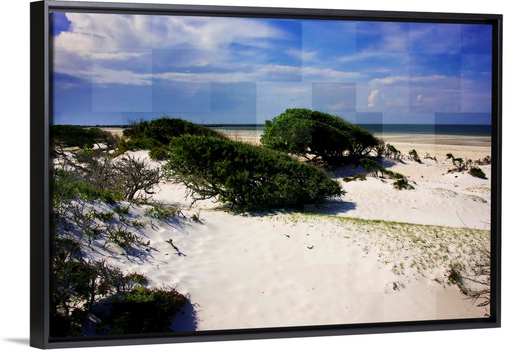<p>A sandy beach under a bright blue sky, with square shapes in the sky.</p>
