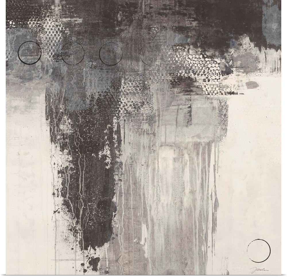 <p>A square abstract painting in varies tones of gray with thin black circles overlaying.</p>