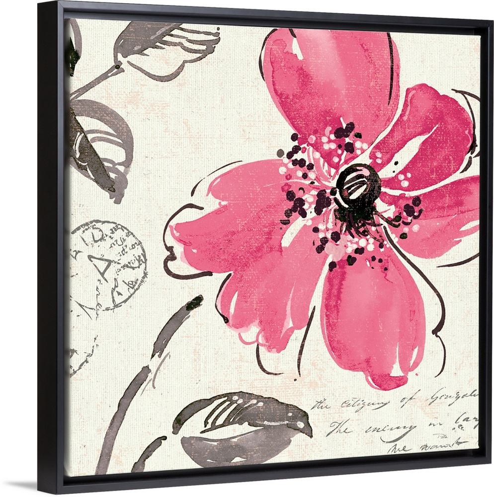 <p>Close up artwork of a blooming flower with script and post office codes along with leaves. Vibrant color of flower is contrasted with netural tones in the rest of the art piece.</p>