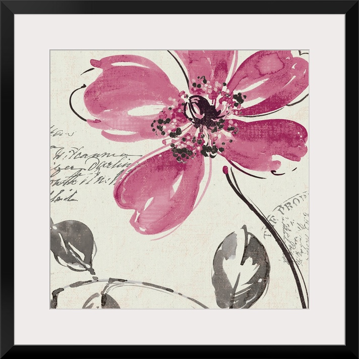 <p>This square shaped decorative accent for the home of office shows an ink drawing of a large five petal flower with hand written text in the background.</p>