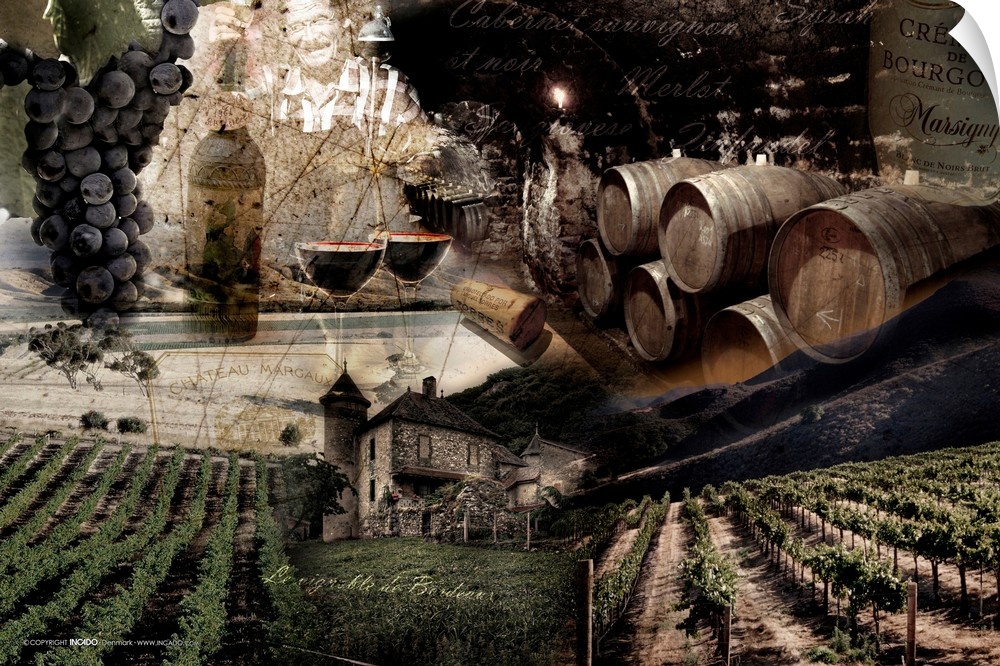 <p>Image composite of a wine vineyard, including grapes and wine barrels.</p>