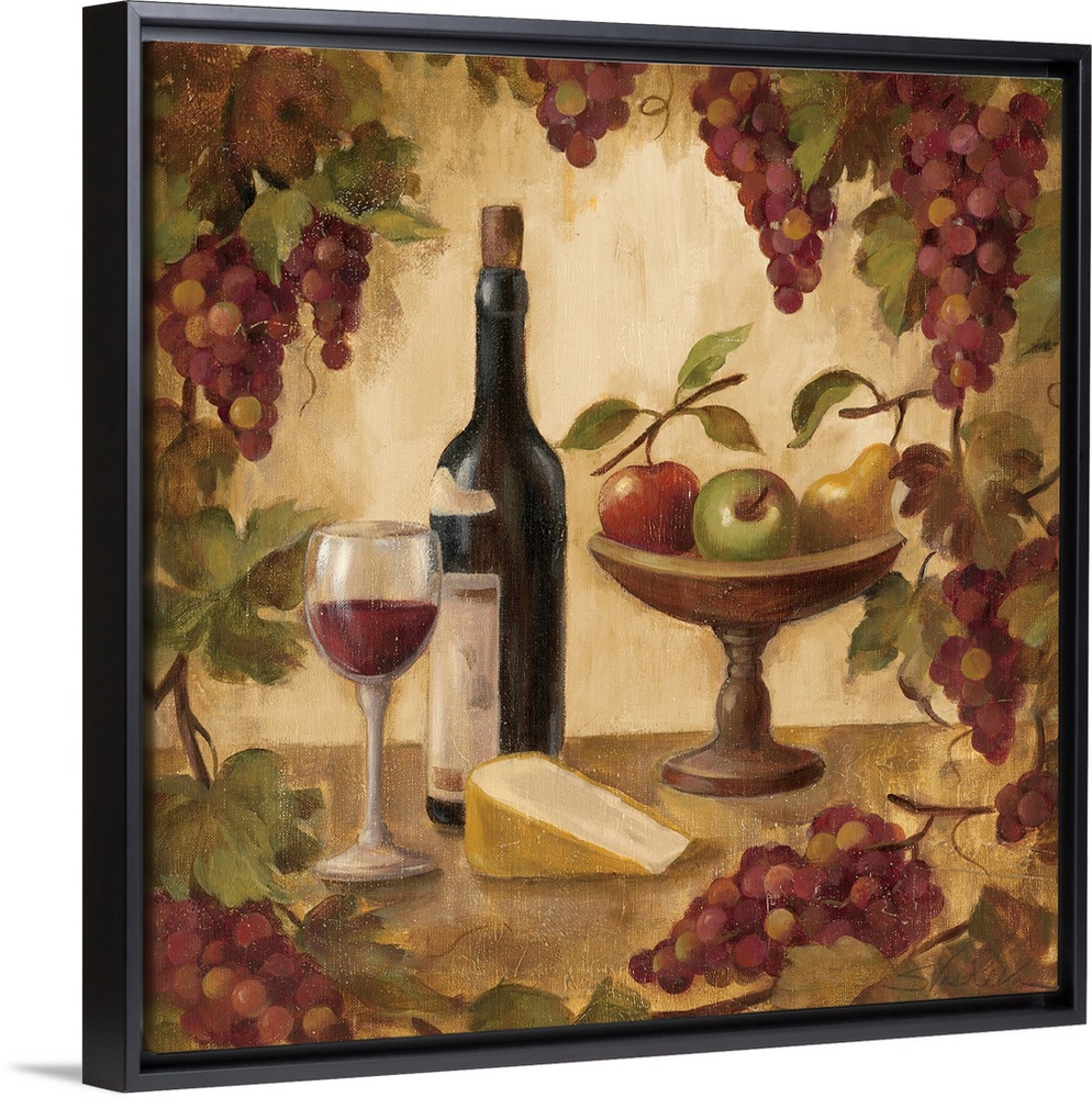 <p>Grapes on the vine act as a border to fruit, wine and cheese that are drawn in the middle of the print.</p>