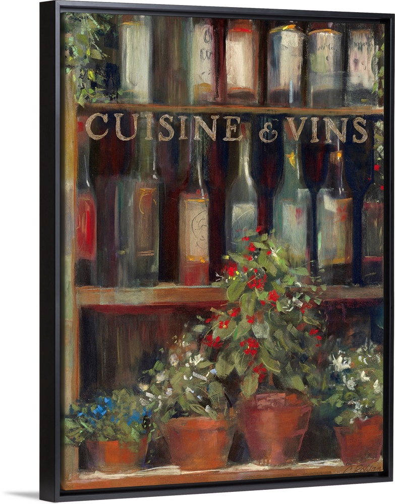 <p>Large contemporary art showcases a section of three shelves within a cabinet that are filled with an assortment of bottles containing fermented grape juice sitting above a line of potted plants.</p>