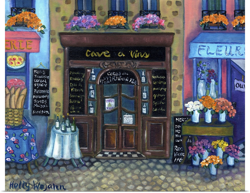 <p>Whimsical painting of a French marketplace next to a flower shop, with wine on the table.</p>