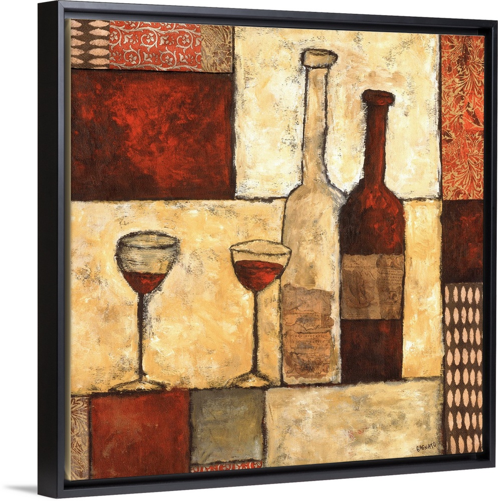 <p>Contemporary artwork of two bottles of wine with a geometric block pattern background.</p>