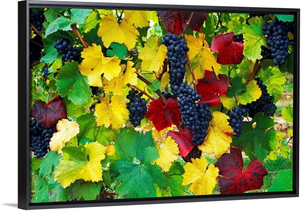 <p>Huge photograph includes clumps of fruit dangling from thin branches encompassed by colorful leaves within the Northwestern United States.</p>
